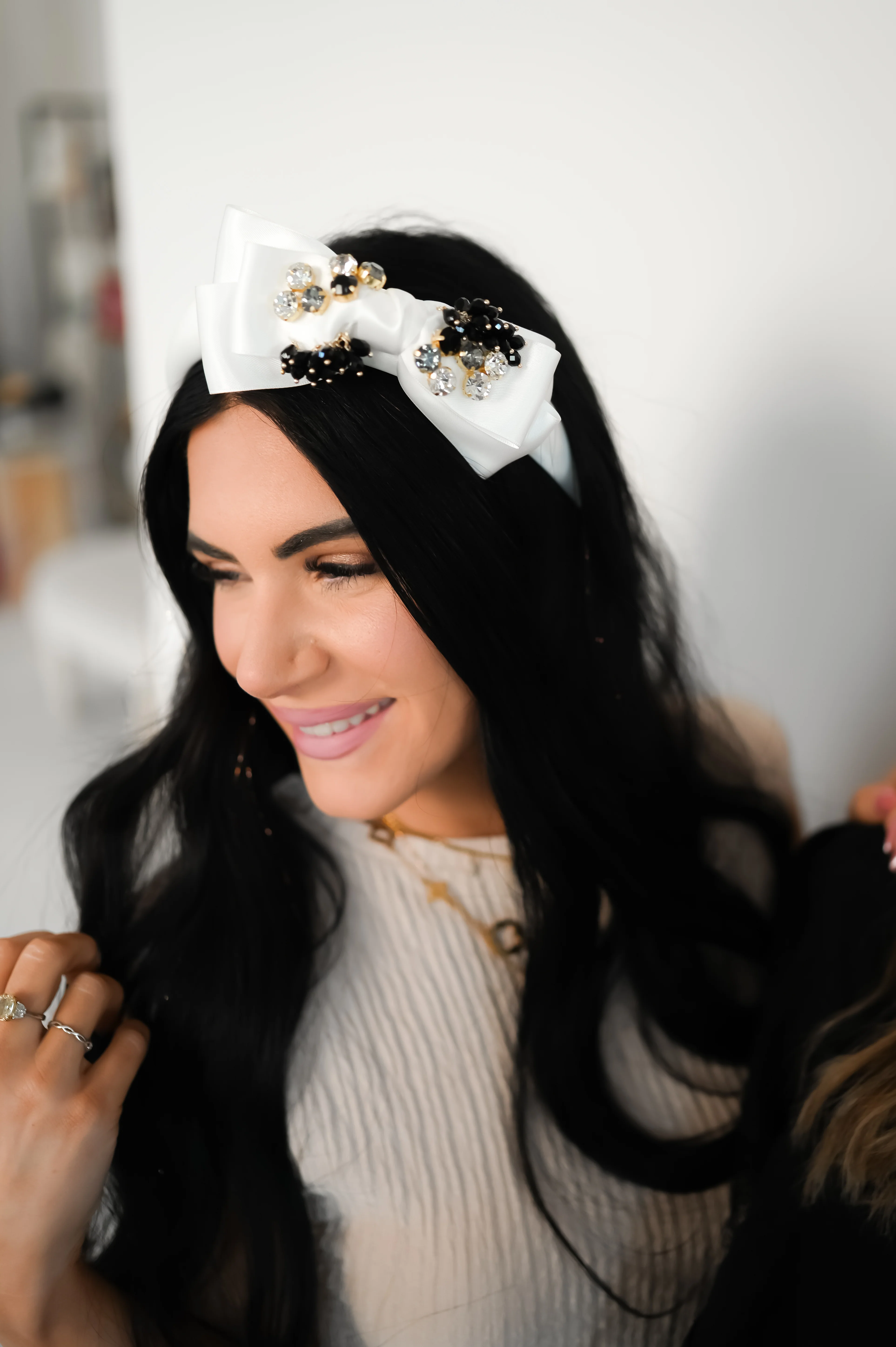 - 180-flexible white satin band with triple-loop satin bow