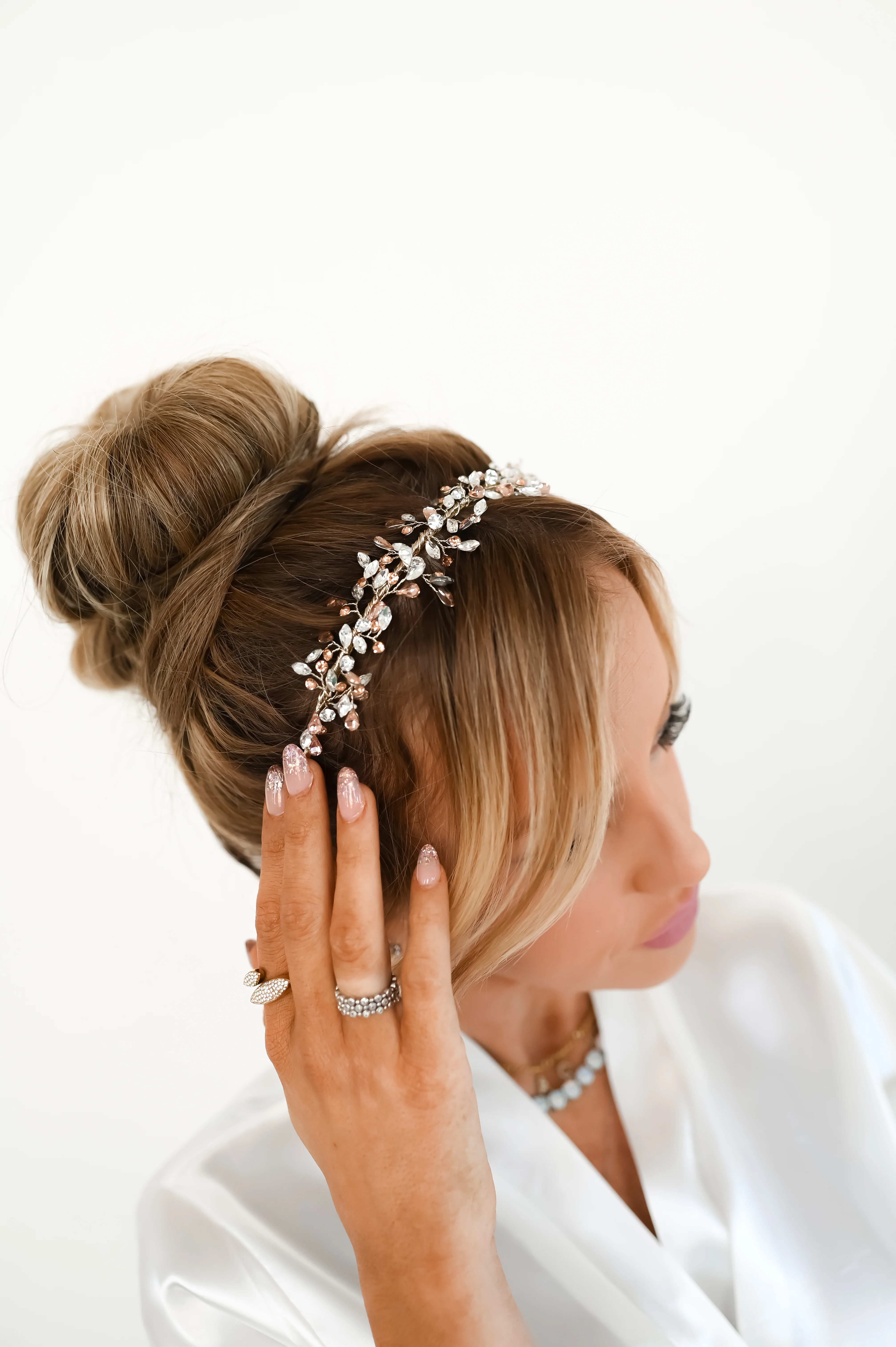 This headband arrives as shown in the first photo. The flexible vine details can be gently adjusted to your desired arrangement upon delivery.