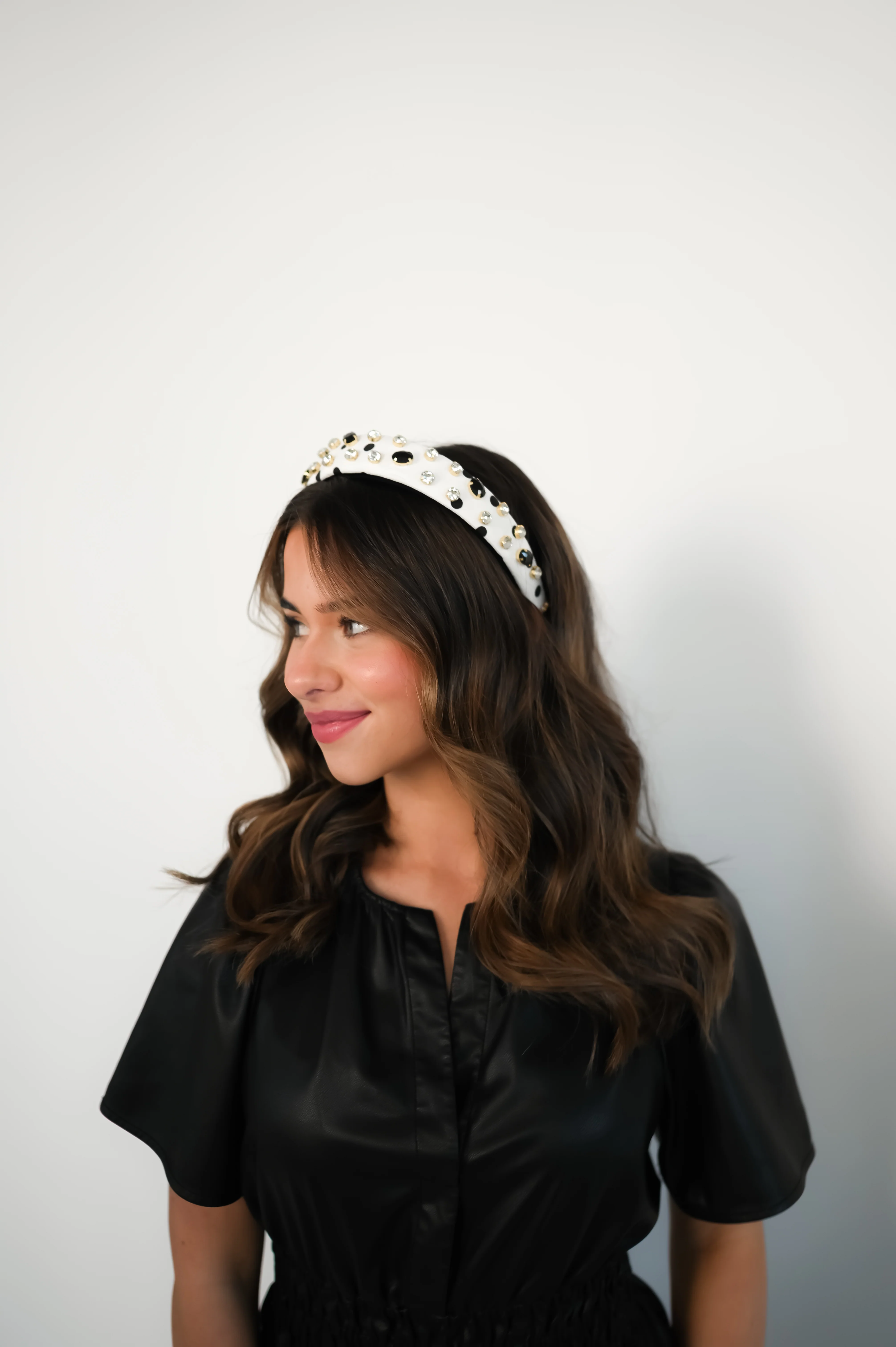 - White satin polka-dot band with 180-degree flex for maximum comfort
