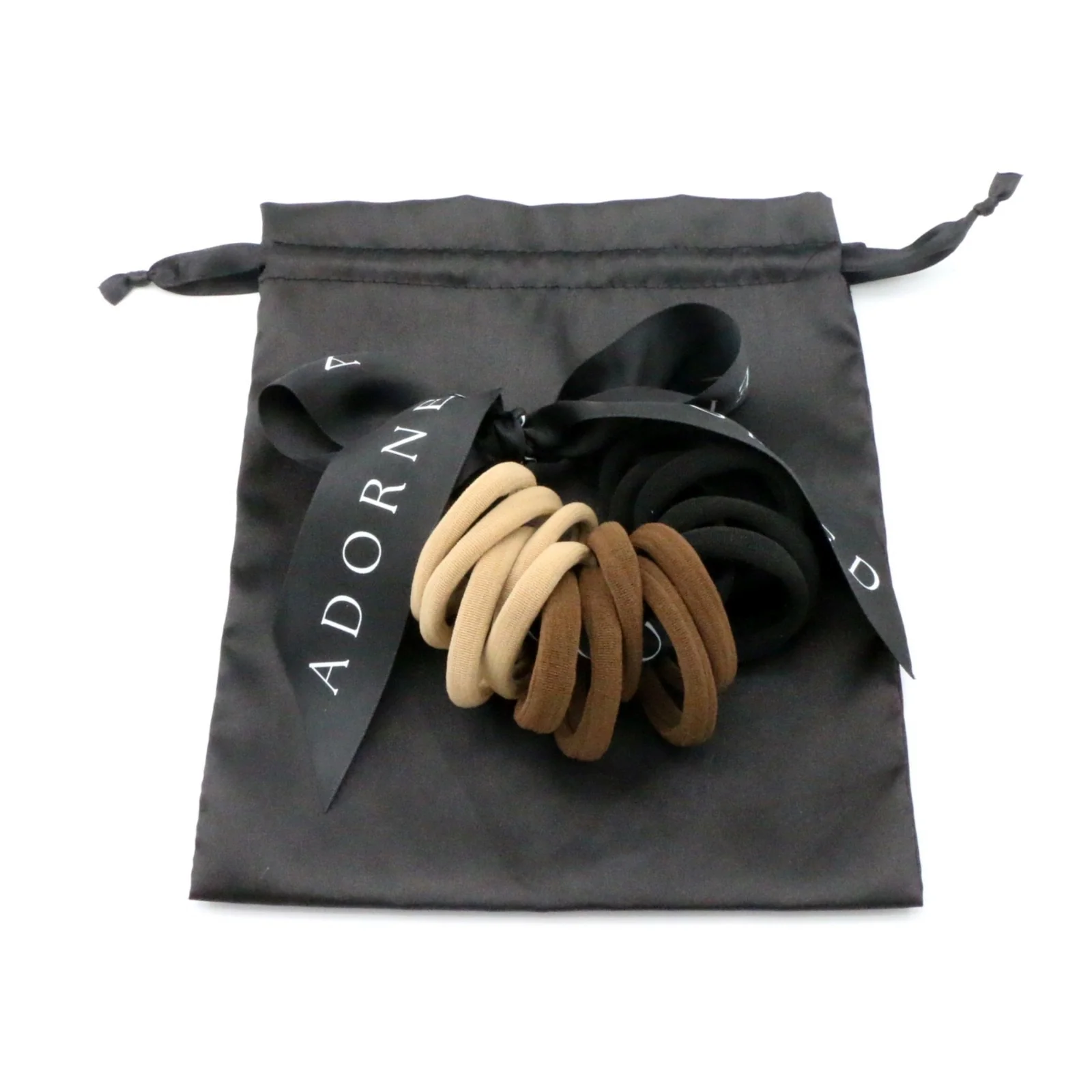 Our Luxe Neutral Hair Ties arrive in one of our signature embroidered satin pouches, tied with a custom Adorned ribbon! Each set includes six tan, six brown, and six black high-tension hair ties.