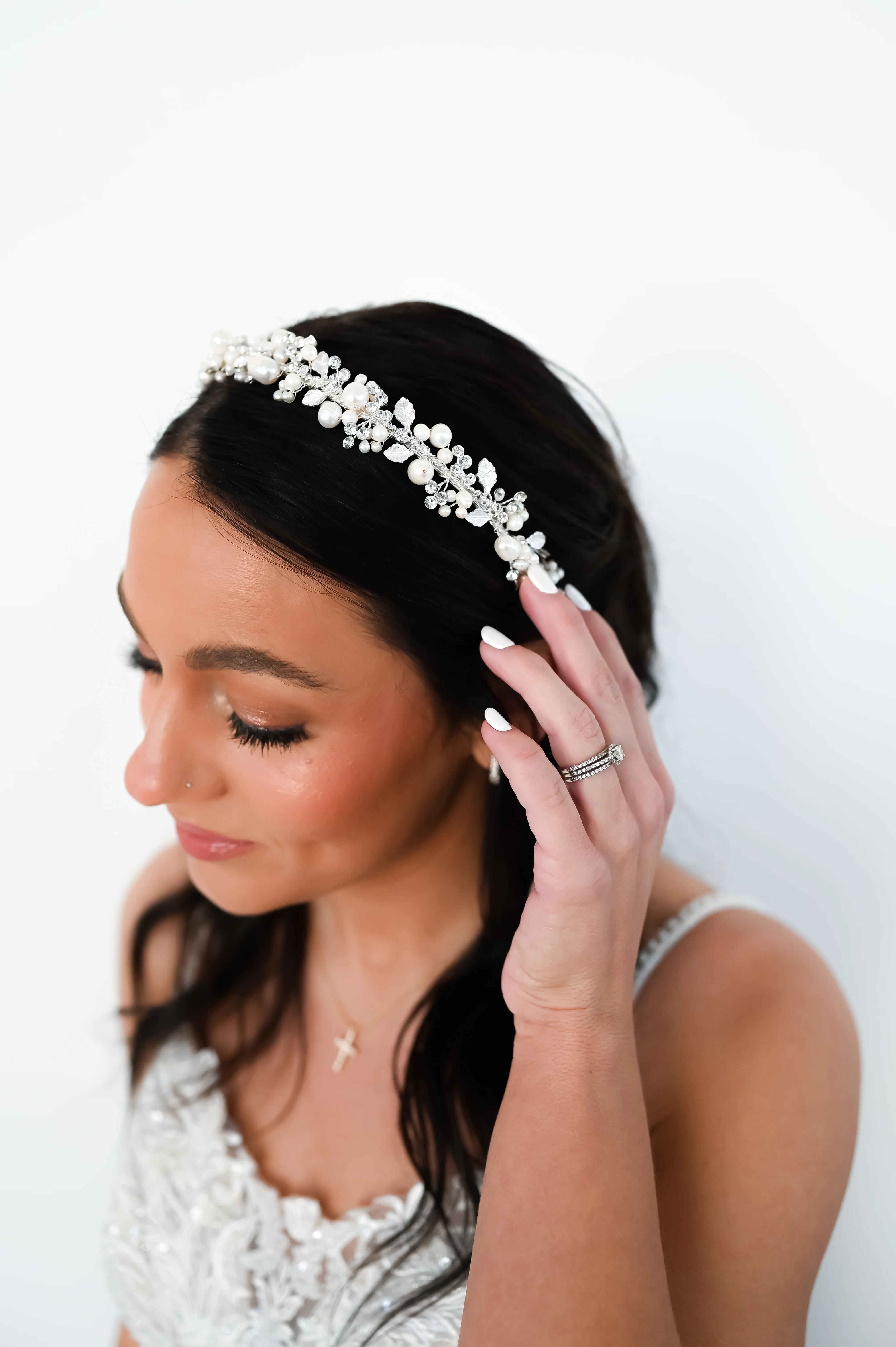 This one-of-a-kind headpiece features intricate silver vining braided with genuine pearls. Key details: