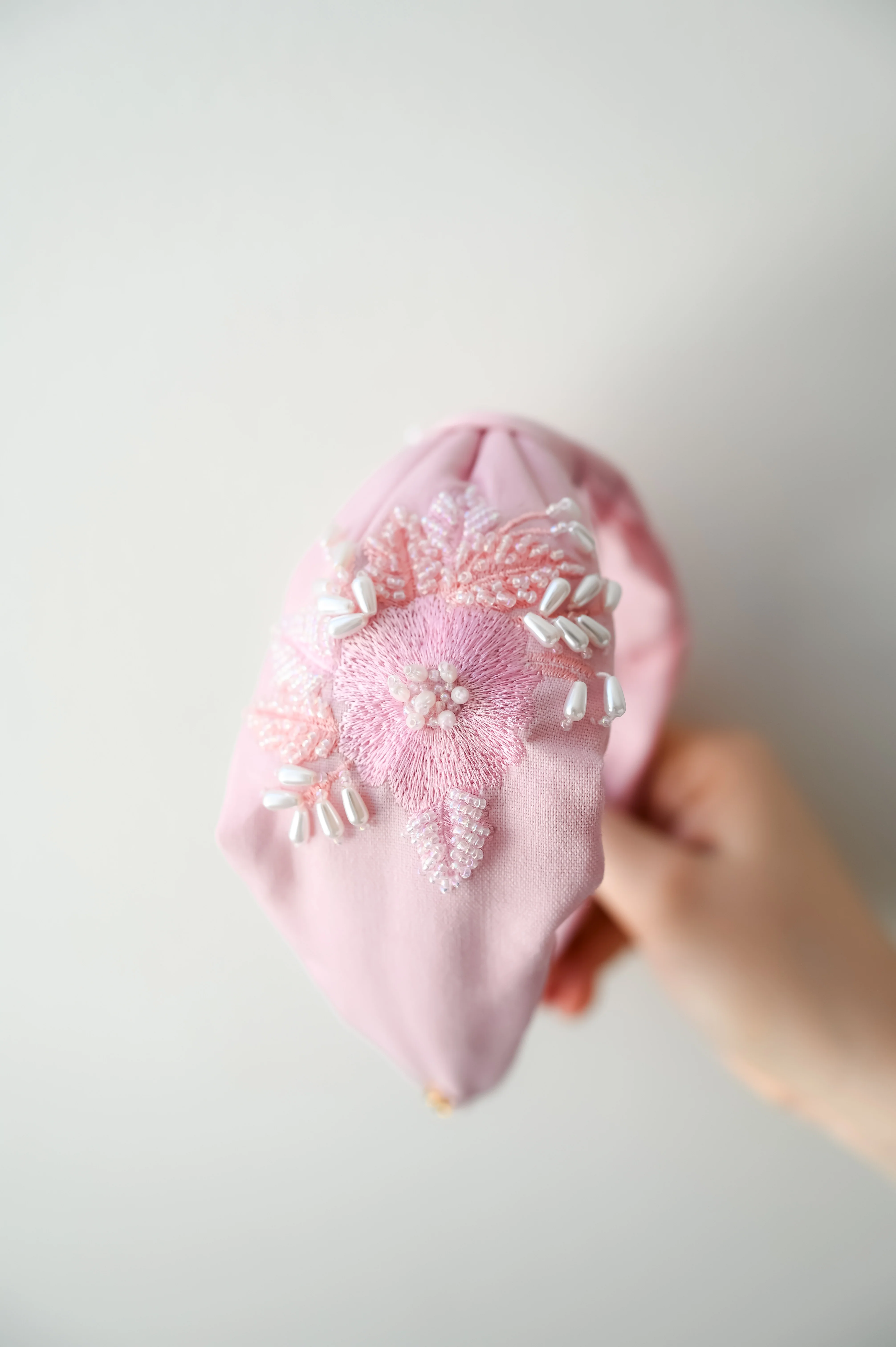 - 180-degree flexible, pink canvas band with hand-beaded floral embroidery